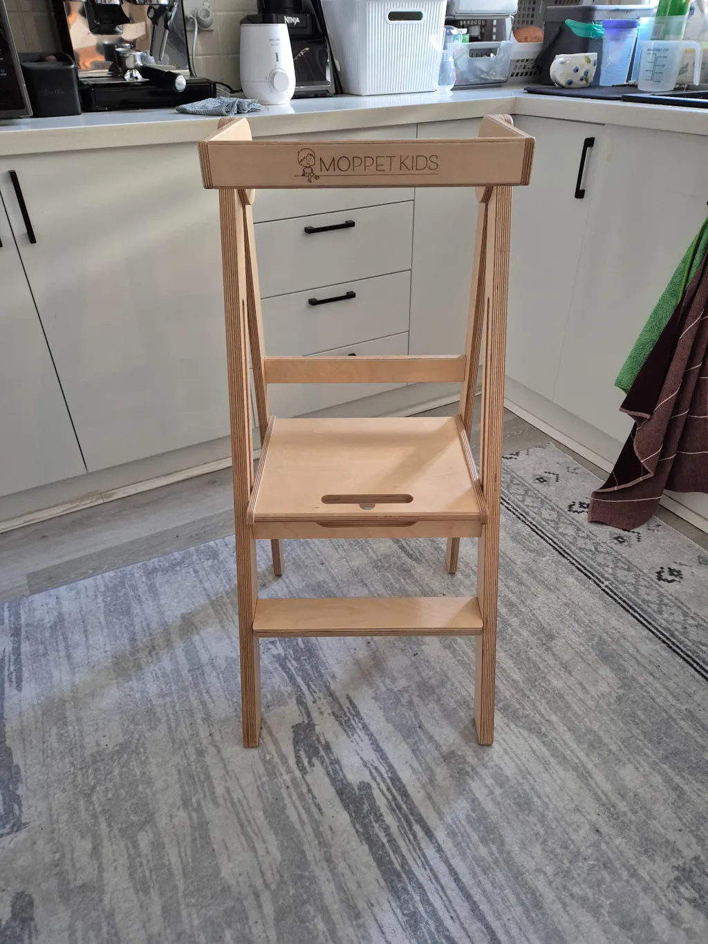 The Moppet Kids Folding Learning Tower is engineered to hold up to 120kg – the strongest foldable learning tower on the Australian market. This makes it perfect for use around the house. Think lightbulbs, smoke alarms, top cupboards, painting etc you'll be amazed at how often you reach for it.